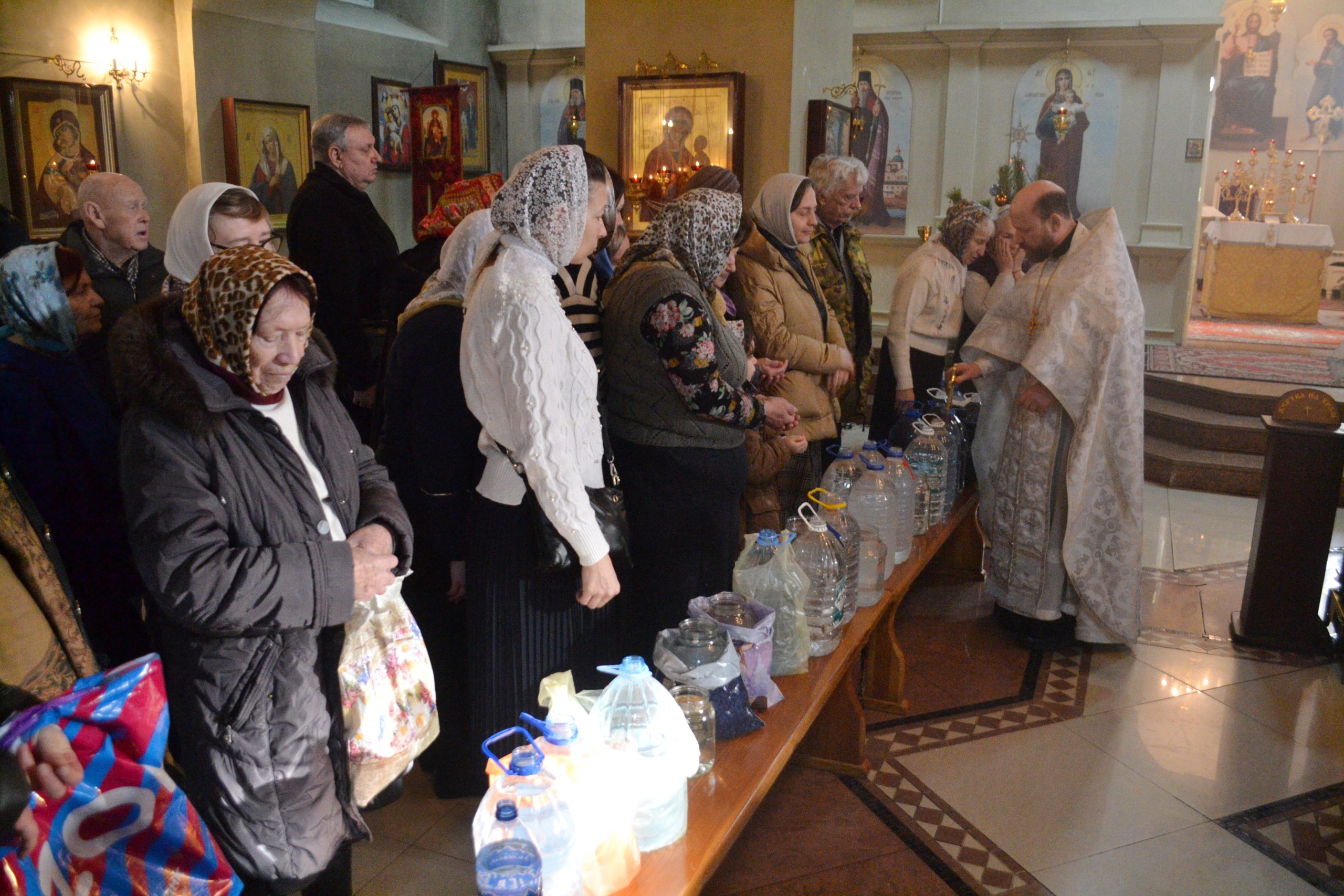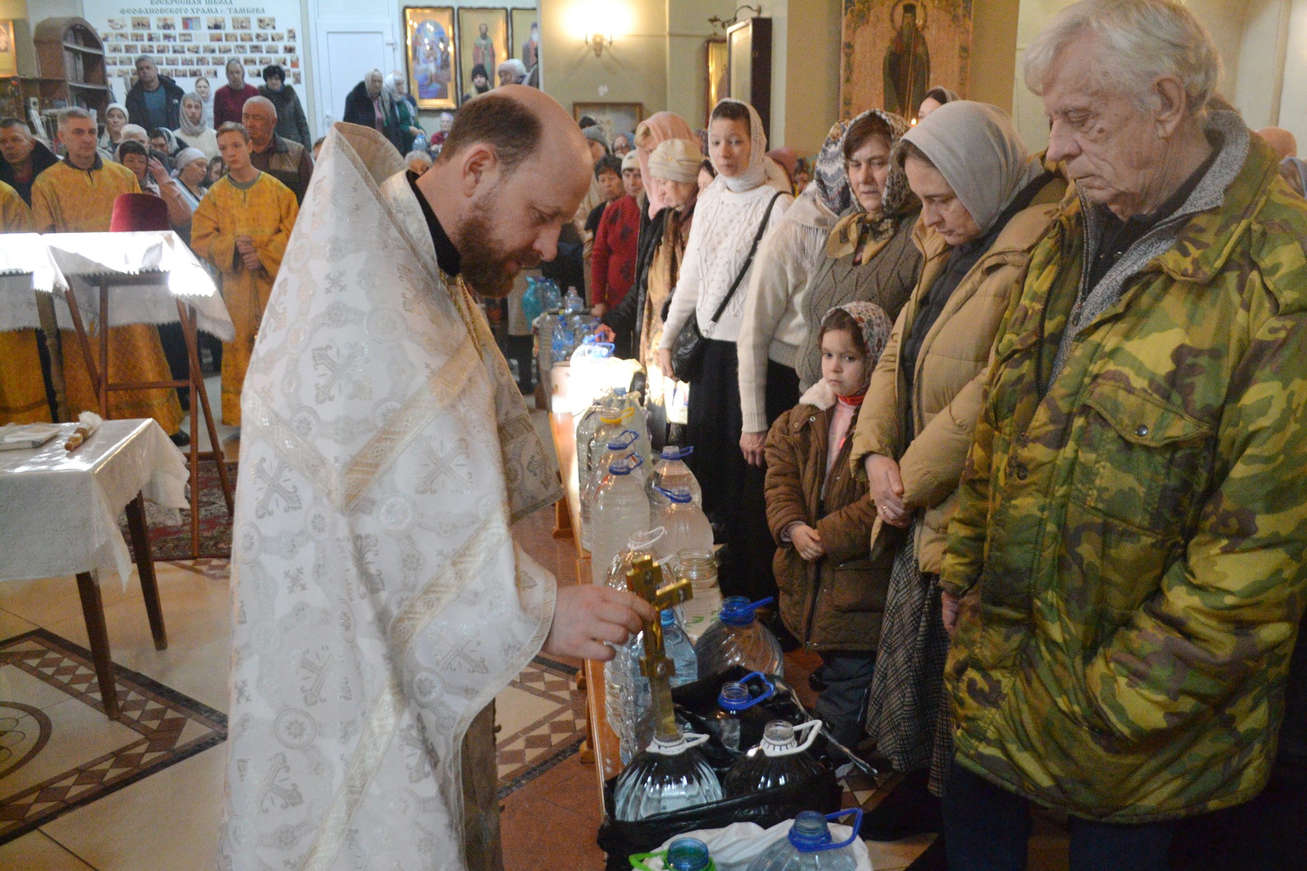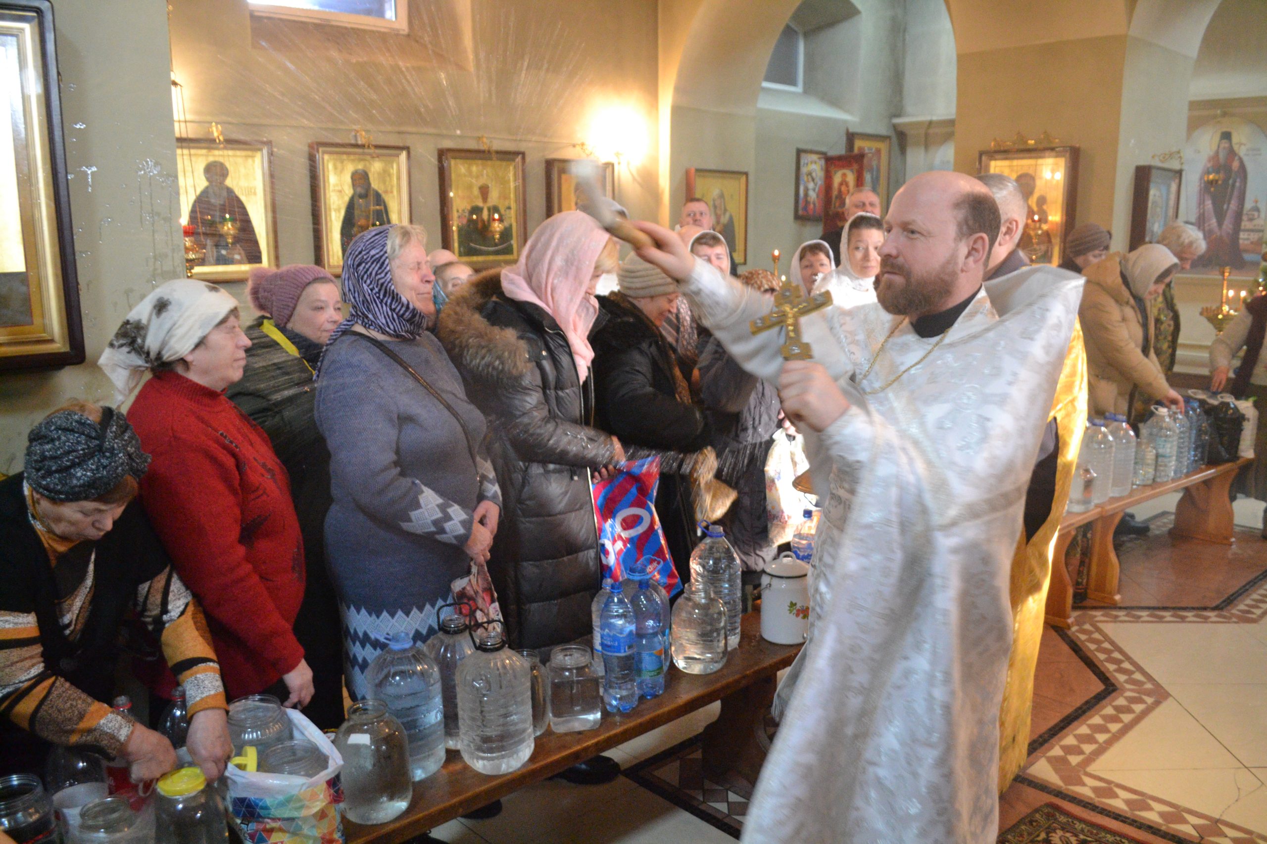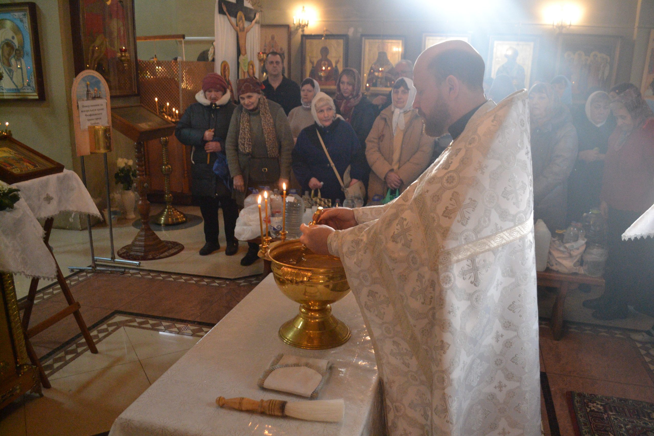 По окончании Литургии состоялась великая вечерня, в конце которой под пение тропарей «Глас Господень на водах» священнослужители вышли в центр храма, где настоятель храма совершил великое освящение воды.