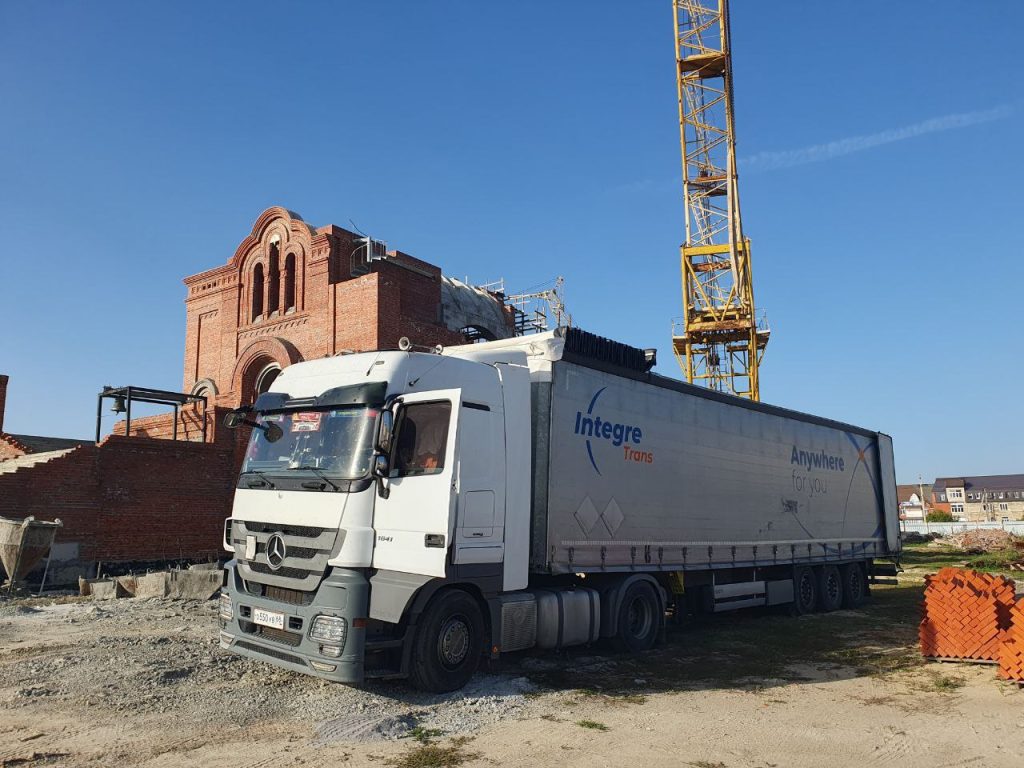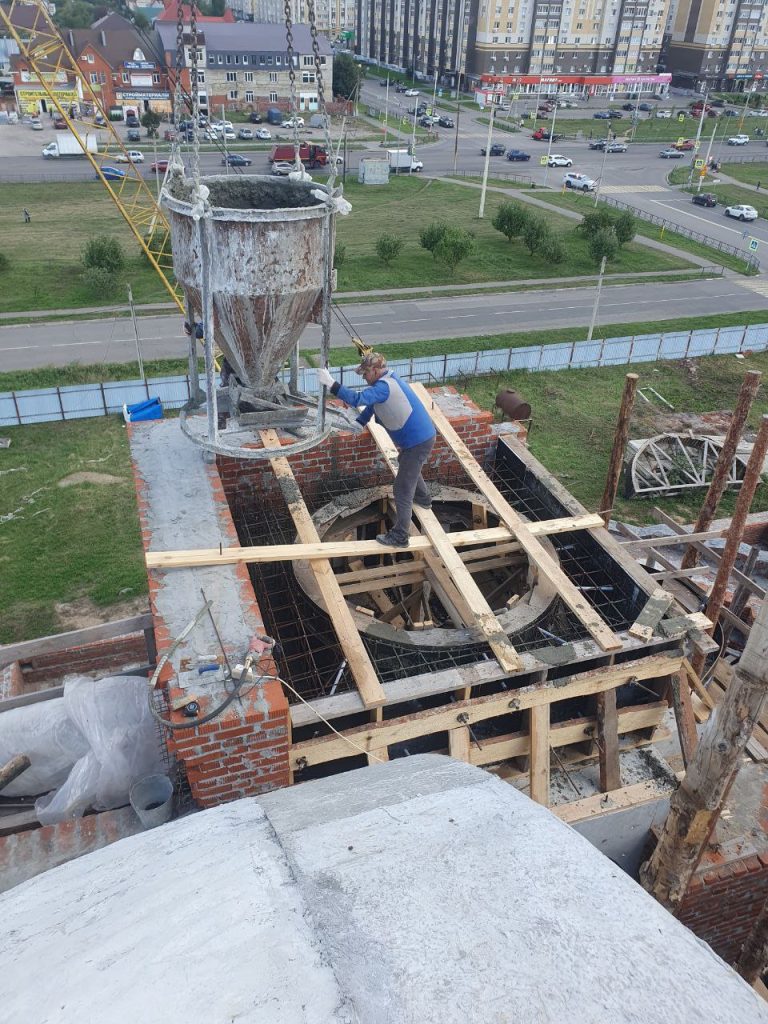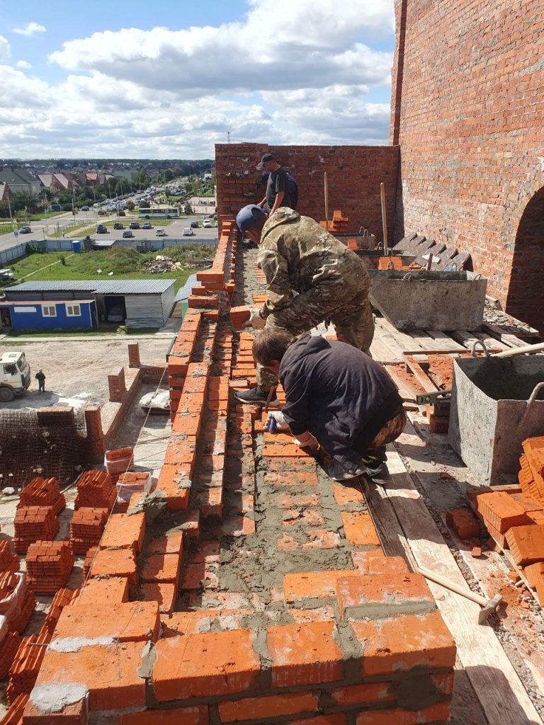 Продолдается строительство храма. Текущий этап — кирпичная кладка арочного оконного проёма в стене колокольни по западной стороне.