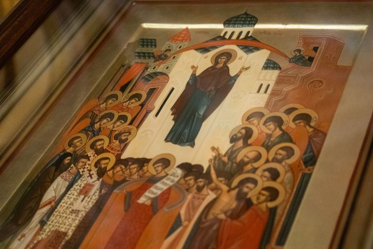 Ра́дуйся, Ра́досте на́ша, покры́й на́с от вся́каго зла́ честны́м Твои́м омофо́ром.
